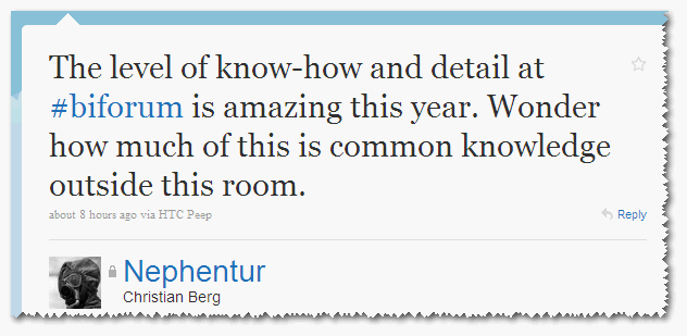 To sum up, a fantastic event and well done to Mark and the rest of RittmanMead for organising it - there was obviously a lot of work that went into getting it to run so smoothly. It was great having it all based around the hotel and I can imagine hopefully the same people coming back year after year. As a typical geek I shrink at the word “networking”, but if you think of it as an opportunity to meet other geeks who get hot under the collar at the same things you do it’s less scary. In seriousness, if you work with OBIEE or areas related to it, you should sign up for the forum now. The sum of the whole is much greater than the sum of just the presentations. The opportunity to pick other’s brains for experiences is invaluable, as is being able to collar Oracle product managers and bend their ears (sorry Adam, if I spoilt your dinner ;-))