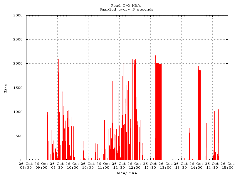 [sourcecode language=“bash”] # Download the file from a remote server # Prompts for password, or use ssh key authentication to make it seamless scp user@remotehost:/tmp/io.DBINSTANCE.log . # Convert bar (|) to Space ( ) sed -e ’s/|/ /g’ io.DBINSTANCE.log > io.log # Plot a graph (remove –persist if you don’t want the window displayed) gnuplot –persist «EOF set title “Read I/O MB/s\nSampled every 5 seconds” set xdata time set timefmt “%Y-%m-%d-%H:%M:%S” set format x “%d %b\n%H:%M” set ylabel “MB/s” # You can set the y range to a specific constant based on your IO capacity set yrange [0:3000] set xlabel “Date/Time” unset key set grid plot “io.log” using 1:3 with boxes fs set terminal png font “courier, 10” size 1200,800 set output “io.png” replot EOF [/sourcecode]