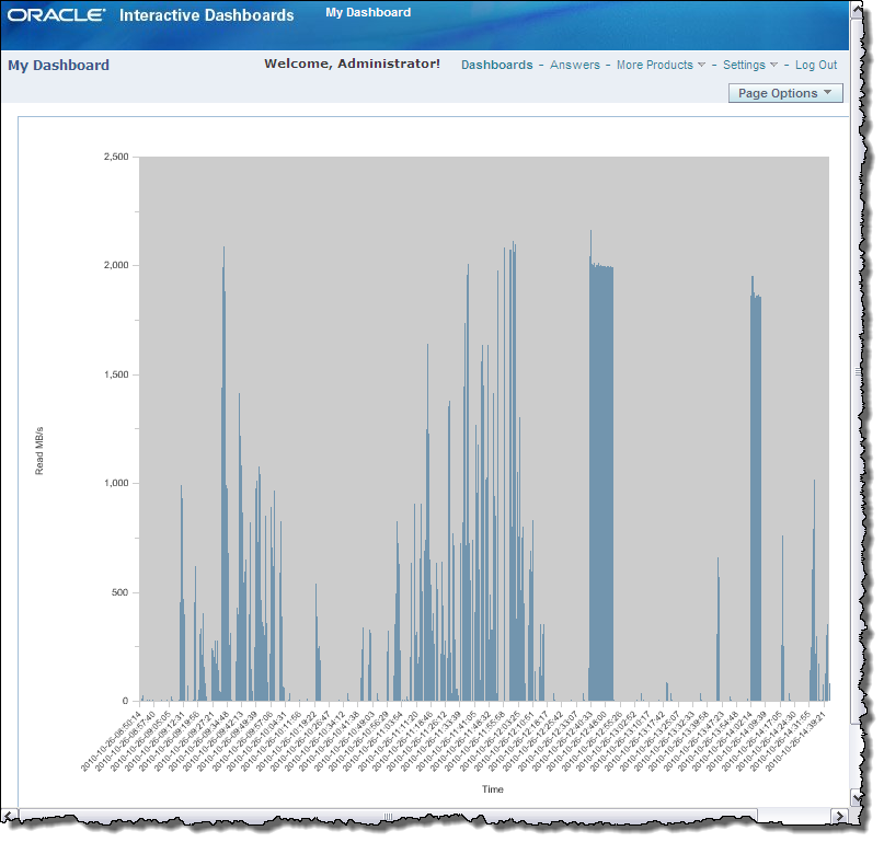 Why would you want to do this when you’ve got a pretty GUI in EM/Grid and flash graphs? Because the data in EM is averaged out over a relatively large sample (one minute for recent history, and whatever your AWR samplerate is for older history) and thus lower than the point-in-time I/O being driven through your server. My previous post (The danger of averages) illustrates this. For identifying bottlenecks or capacity planning, you need to know how much I/O throughput you really use. Consider this rough example: Using V$SYSMETRIC_HISTORY you can get an average over the last minute. For the first 30 seconds of this sampled minute you ran a query consuming I/O at 100 MB/s. For the last 30 seconds there was no system activity. V$SYSMETRIC_HISTORY shows a figure of 50 MB/s, as this is the average over a minute. You look at your system’s IO profile in EM and see 50 MB/s. Your hardware guys tell you that the system has a capacity of 100 MB/s throughput, so you think you’re well in the clear for capacity, when in reality you’re already hitting it. Now, what happens when two instances of this same query - each requiring 100 MB/s - runs? It will take twice as long when run concurrently (because they’ll have to share the throughput available, and thus get ~50 MB/s). It might be that this is acceptable, that the trade-off of hardware cost to increase I/O throughput capacity isn’t justifiable for making the queries run faster. But it’s important to be aware of the bottlenecks in a system so that they can be mitigated and considered in any capacity planning.