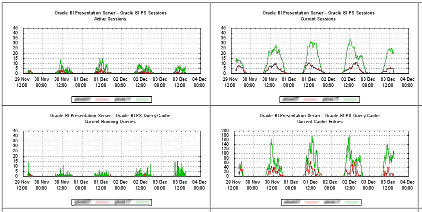 Those of you who read my blog regularly may have noticed I have a slight obsession with the OBIEE systems management capability which is exposed through JMX. Venkat has blogged this week about JMX in OBI11g, and it’s clearly a technology worth understanding properly. I’ve recently been tinkering with how to make use of it for monitoring purposes, most recently using JConsole and discussed here. What follows is an extension of this idea, cobbled together with a bit of shell scripting, awk, gnuplot, and sticky backed plastic. It’s built on OBIEE 10g - for OBI11g it may differ (although I understand that Performance MBeans still exist).
