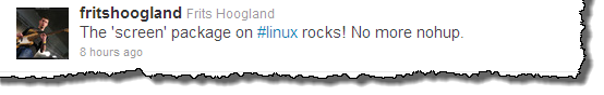 The second discovery is a tool called screen. Innocuously named (and a bugger to search for on google), I’d never heard of it until today when Frits Hoogland mentioned it and the subsequent stream of approving tweets from various geeks whose opinions I respect made me go and read up about it.