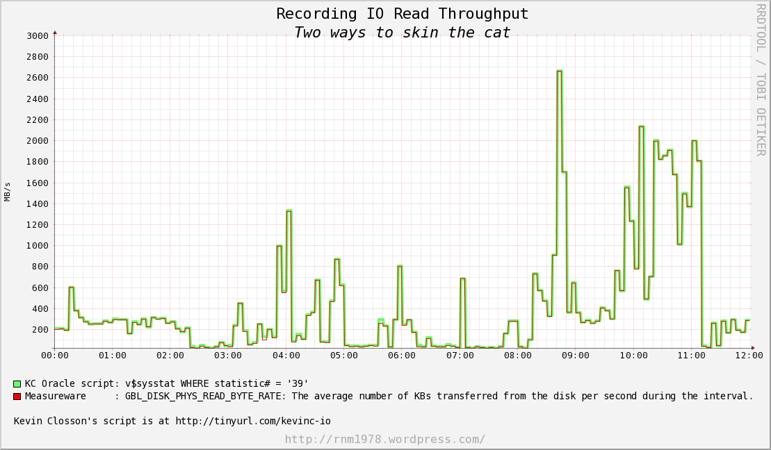 I wrote last year about Graphing I/O data using gnuplot and Oracle V$SYSSTAT, using a script from Kevin Closson in his article How To Produce Raw, Spreadsheet-Ready Physical I/O Data With PL/SQL. Good For Exadata, Good For Traditional Storage. Here I’ve got a simple comparison of the data recorded through this script (in essence, Oracle’s V$SYSSTAT), and directly on the OS through HP’s MeasureWare. It’s graphed out with my new favourite tool, rrdtool: