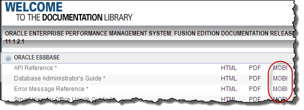 It looks like the availability of mobi/epub files isn’t universal. For example, the OBI 11g documentation appears still to be HTML & ZIP only. And whilst the Database documentation doesn’t link to the mobi files on the contents page, only each document’s TOC, the Essbase documentation does: