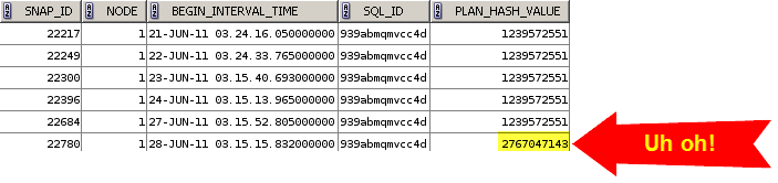 Using Kerry Osborne’s script to look at the plan_hash_value over time from AWR, it was clear that the CBO had picked a new, bad, explain plan.