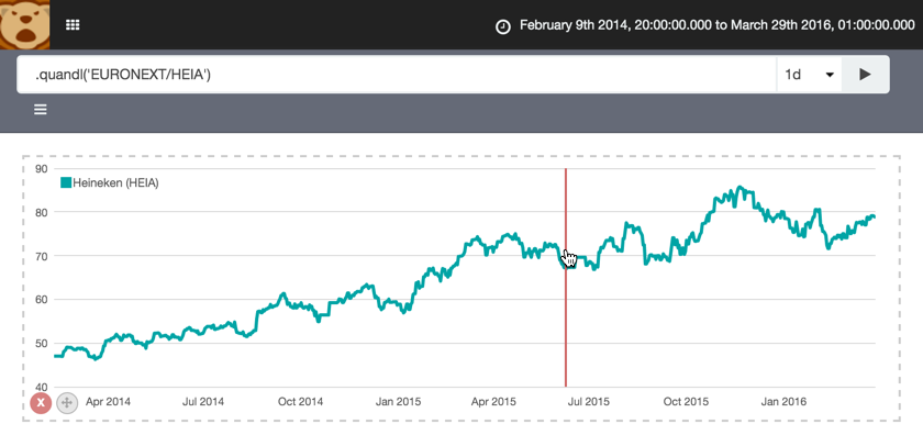 Restart Kibana, and you’re good to go. To use Quandl find the timeseries of interest on the Quandl website. In this example we’ve got the stock price of Heineken. In the top-right you’ll see the Quandl API code (in this example, it’s EURONEXT/HEIA):
