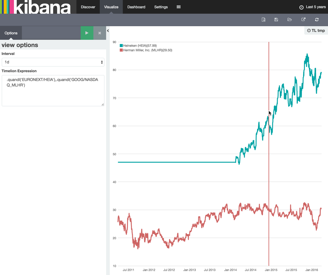 Head over to Timelion and create a new timeseries expression, using the Quandl API code you just got and the Timelion .quandl function: