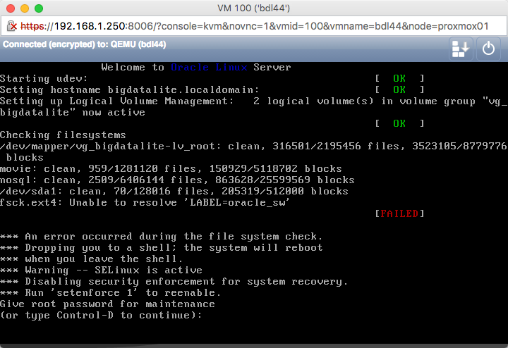 From the Proxmox GUI I started the migrated VM, but it failed with the error Unable to resolve 'LABEL=oracle_sw'
