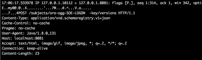 Let’s dig a bit deeper. Since the debug log of the OGG Kafka Connect handler doesn’t tell us anything more, let’s see if we can spot anything in what is being sent to the Schema Registry in that HTTP call. Enter tcpdump.
