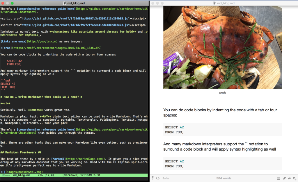 The best of these by a mile on the Mac is Marked2. It gives you a nice rendering of any markdown document that you’re working on. Used with the El Capitan split-screen it’s pretty-near perfect way to write Markdown.