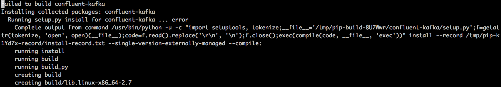 Command "/usr/bin/python -u -c "import setuptools, tokenize;__file__='/tmp/pip-build-8U7Wwr/confluent-kafka/setup.py';f=getattr(tokenize, 'open', open)(__file__);code=f.read().replace('\r\n', '\n');f.close();exec(compile(code, __file__, 'exec'))" install --record /tmp/pip-k1Yd7x-record/install-record.txt --single-version-externally-managed --compile" failed with error code 1 in /tmp/pip-build-8U7Wwr/confluent-kafka/