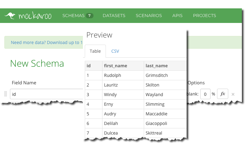 So you can build up realistic datasets at a few clicks of the mouse, and then export them to a bunch of formats, including CSV, JSON, and even SQL INSERT INTO statements (and, of course, it also provides the CREATE TABLE DDL!).
