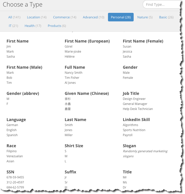 What sets it apart from SELECT RANDOM(100) FROM DUMMY; is that it has lots of different classes of test data for you to choose from. Wanting to simulate some users? Here you go: