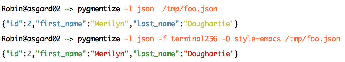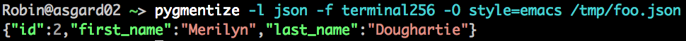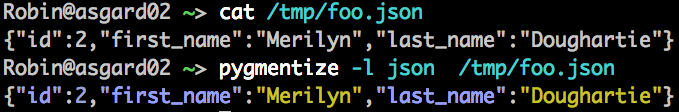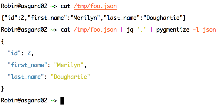 cat /tmp/foo.json | jq '.' | pygmentize -l json