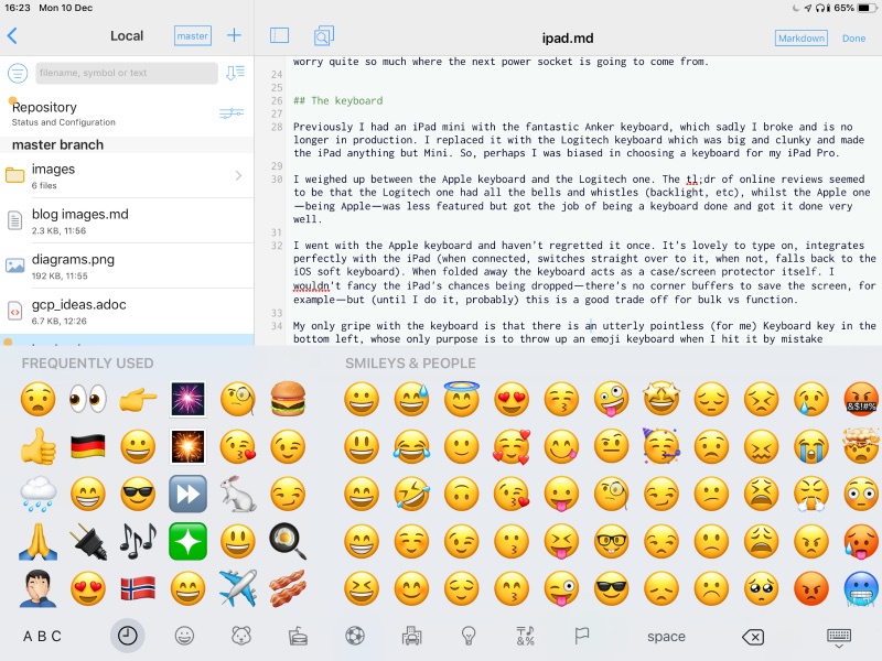 I am Keynote through-and-through, and the iPad is great for that. With “handoff” I can even have a presentation open on my Mac, modify a slide, open my iPad and modify the same slide (perhaps using the Apple Pencil to mark it up in some way) and then continue on my Mac. The Keynote app keeps getting better and better, and I can quite happily put together a set of slides using the iPad Pro alone. Here I think the keyboard makes the real difference. Without it, it becomes more of a “because I can” than a “because why wouldn’t I” task to use the iPad. I’ve yet present from the iPad but do have the connector for the time when the opportunity presents itself (i.e. I don’t need to do a live demo and I pluck up the courage ;-) )