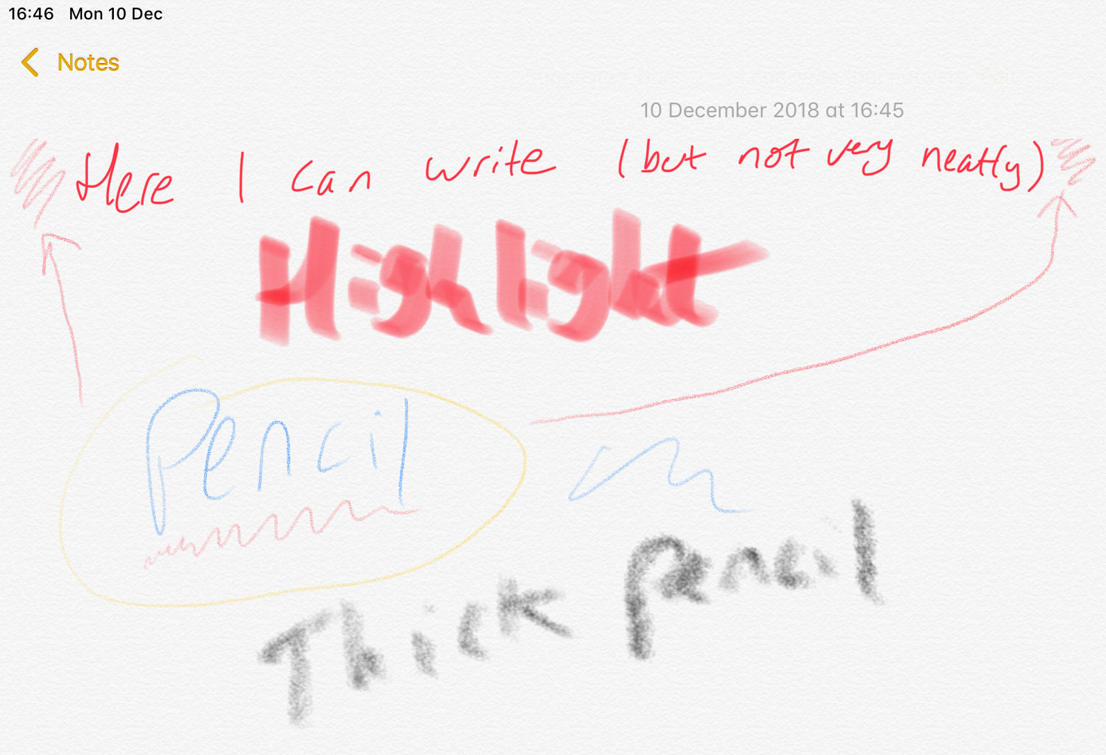 I used a bog standard stylus with my iPad Mini previously, and so from that my expectations for the Apple Pencil were pretty low. I thought I’d be able to write on the screen but only at a low resolution, kind of fun but ultimately useless. The Apple Pencil is anything but useless. It’s amazingly high resolution, responsive, and a pleasure to use. It integrates with Notes for note taking (duh!), and you can pretty credibly leave your notebook behind and use this instead (or pair it with the keyboard for written notes and the pencil for sketching diagrams etc).