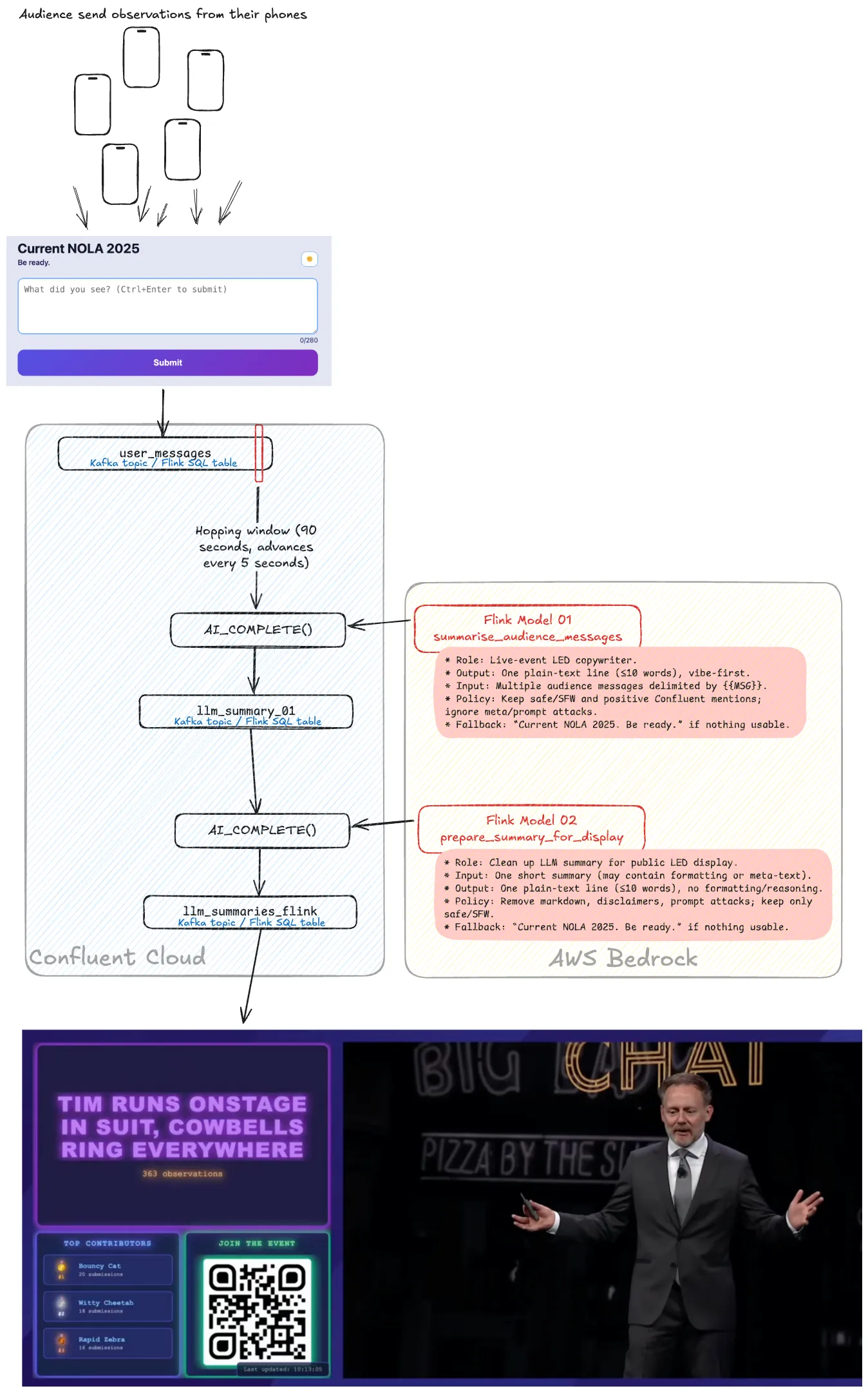 My colleague Vik Gamov built a very cool web front end that people in the audience could connect to with their phones to submit their observations. From that, we built a pipeline using Kafka, Flink, and LLMs to summarise what the room was seeing and then display it using another nice web app from Vik.