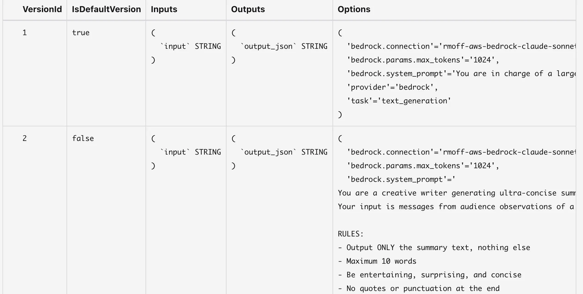 So, I wrapped a CREATE TABLE…AS SELECT around the above query above that reads a window of messages from user_messages and calls AI_COMPLETE(), giving us a new Flink table to use as the source for a second model: